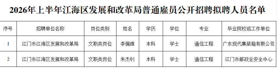 根据《关于印发〈江门高新区(江海区)区直机关事业单位雇员管理办法(试行)〉的通知》(江海组通〔2022〕15号)和《2026年上半年江海区直机关事业单位普通雇员公开招聘公告》规定,经笔试、面试、体检、考察等程序,拟聘用李佩维、朱杰钊等2人为江门市江海区发展和改革局普通雇员(详见下表),现予以公示。