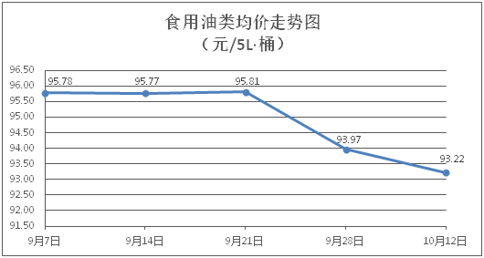 食用油类商品价格普遍微降。所监测的9种食用油(5L装)商品价格波动情况为1涨8跌,综合零售均价为每桶93.22元,环比下降0.80%。其中:鲁花花生油、金龙鱼调和油零售均价分别为每桶156.47元、70.36元,环比分别下降0.10%、下降0.42%。