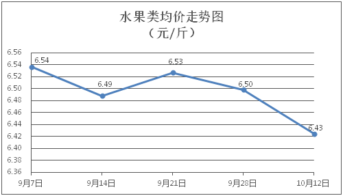 水果类商品价格小幅波动。所监测的6种水果商品价格波动情况为3涨3跌,综合零售均价为每斤6.43元,环比下降1.13%。其中橙子、香蕉、西瓜零售均价分别为每斤7.65元、2.88元、3.09元,环比分别上涨1.59%、下降2.37%、下降1.28%。