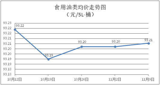 食用油类商品价格基本平稳。所监测的食用油(5L装)商品价格波动情况为1涨1跌7平,综合零售均价为每桶93.21元,环比上涨0.004%。其中:大豆油、金龙鱼调和油零售均价分别为每桶60.46元、70.52元,环比分别上涨0.13%、下降0.07%。