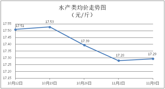 水产类商品价格总体略涨。所监测的9种水产商品价格波动情况为6涨3跌,综合均价为每斤17.29元,环比上涨0.08%。其中:草鱼、鳙鱼、罗非鱼、基围虾零售均价分别为每斤11.43元、10.59元、8.86元、28.32元,环比分别上涨0.88%、上涨0.47%、上涨0.34%、下降0.32%。