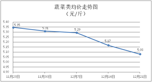 据本市21家农贸市场监测数据显示,上周(12月15日至12月21日)市场上各类“菜篮子”商品供应充足,所监测的7大类“菜篮子”商品价格环比总体表现为1涨5跌1平。其中:粮油类商品价格以稳为主,肉类、蔬果类、水产类商品价格总体略降,禽蛋类商品价格稳中略涨。