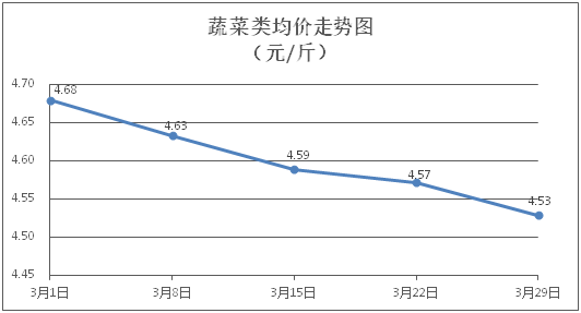 蔬菜类商品价格总体略降。所监测的蔬菜商品价格波动情况为12涨19跌1平,综合零售均价为每斤4.53元,环比下降0.94%。其中:涨幅居前的品种包括青豆角、苦瓜、西洋菜,零售均价分别为每斤6.77元、5.91元、3.54元,环比分别上涨2.58%、2.07%、1.72%;跌幅靠前的品种为丝瓜、青瓜、本地菜心,零售均价分别为每斤4.93元、4.13元、4.52元,环比分别下降6.27%、5.06%、5.04%。