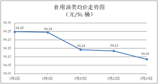 食用油类商品价格稳中微降。所监测的食用油(5L装)商品价格波动情况为1涨4跌4平,综合零售均价为每桶94.09元,环比下降0.05%。其中:鲁花花生油、金龙鱼调和油零售均价分别为每桶155.81元、70.19元,环比分别下降0.10%、下降0.18%。