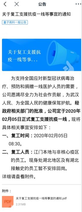 “公司提前做好复工的防疫准备,其中包括防疫物品的准备(口罩、 酒精、洗手液、消毒水)、各项防疫措施的落实细则及每天全体员工的健康排查申报等。