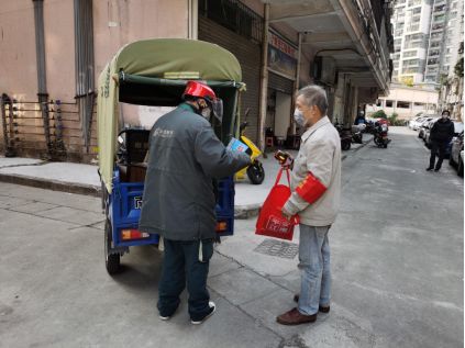 榕叔叮嘱正在准备派件的邮递员要做好防疫措施。