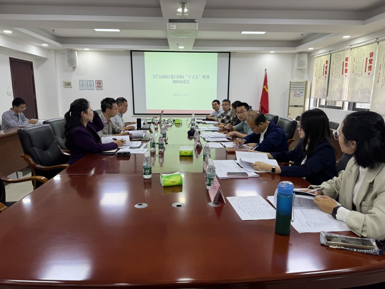 11月7日上午,调研组抵达蓬江区,与蓬江区发改局、科技局、经促局相关负责人围绕蓬江片区在“十五五”规划中的目标定位与重点任务进行深入研讨。