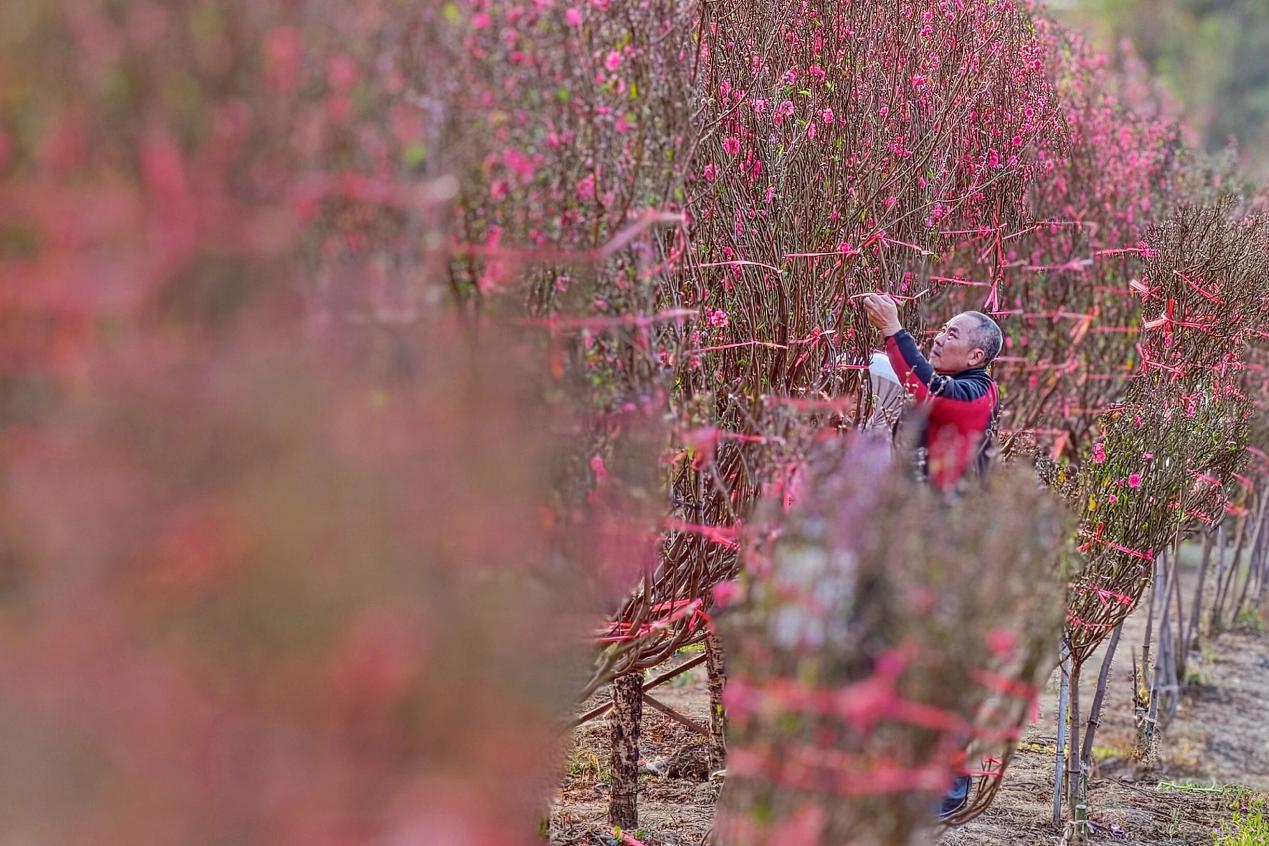 当天下午,从事餐饮行业的陈文广专门从中山赶来。他在桃花林里仔细挑选,最终选中了一盆高大挺拔的桃花。“我们每年都会来向东村挑选桃花,今年选这盆大的放在自己的餐饮店里,就盼着新的一年生意能像这桃花一样红红火火,越来越好!”陈文广说。