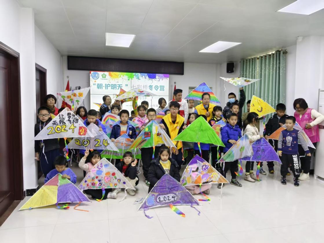 17岁的小豪带领参与“七彩桥”冬令营的孩子们一起制作风筝