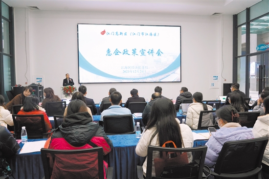 江门日报讯 (文/图 记者/何榕 通讯员/刘乐然) 近日,区经济促进局惠企政策宣讲会在粤湾云谷举行,吸引了近百家企业参加。
